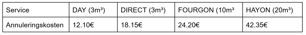 Zie de onderstaande tabel voor de annuleringskosten die van toepassing zijn, afhankelijk van de dienst.