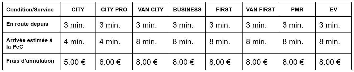 - Pour les services FOURGON et HAYON, si la réservation est immédiate, les frais d’annulation s’appliquent dès que le chauffeur est en route ; si la réservation est planifiée, les frais d’annulation s’appliquent si la réservation est annulée moins de 60 minutes avant l’heure de prise en charge.